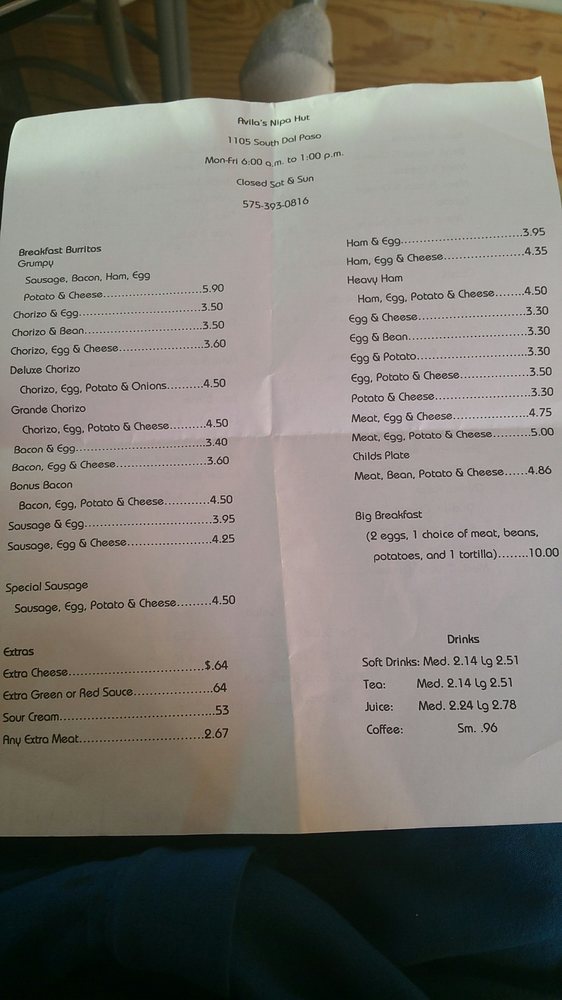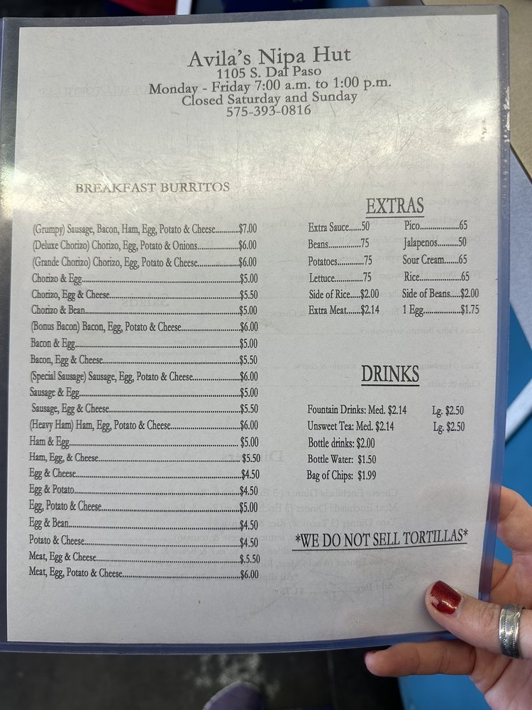Welcome to Nipa Hut Restaurant, a delightful haven for Mexican cuisine nestled in Hobbs, NM. This charming establishment shines with its renowned breakfast burritos, made with homemade tortillas that have garnered rave reviews from both locals and visitors alike. Patrons like Victoria C. and Channing T. praise the generous portions and incredible flavors, while Juan R. hails the Grande Chorizo burrito as a must-try, perfectly complemented by their house-made green salsa.